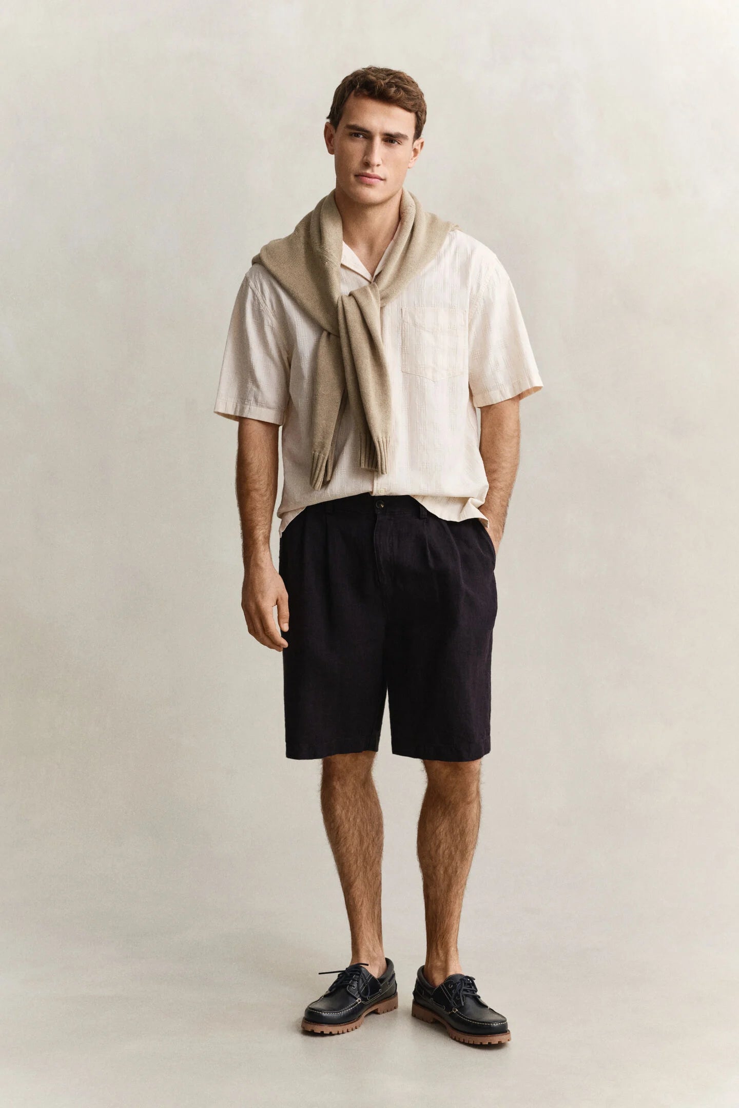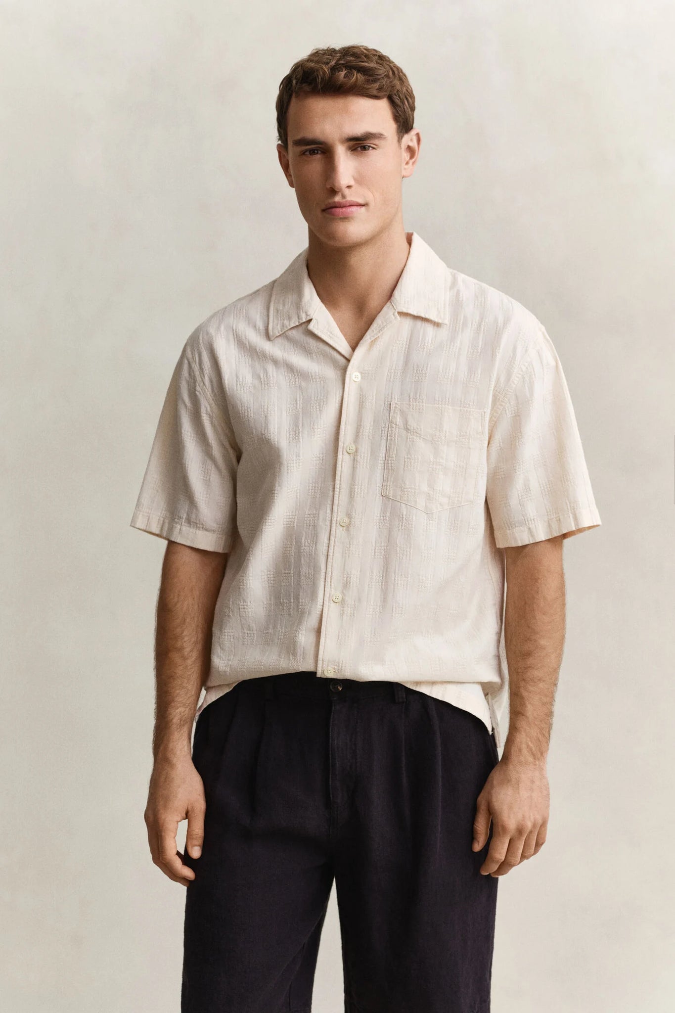 Relaxed fit checked shirt with a laid-back camp collar and chest pocket detail. Crafted from soft cotton with a textured checked fabrication that adds visual interest and dimension. Perfect for casual layering or standalone wear.