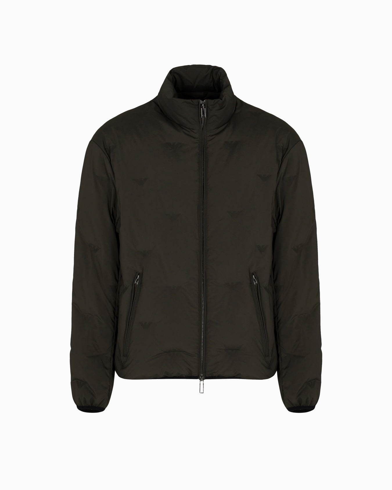 Experience unbeatable warmth and style with this high-performance nylon down jacket. Featuring genuine down padding and an all-over eagle inlay, it combines luxury with functionality. The full zip and long sleeves with stretch cuffs ensure a snug, comfortable fit, while the zippered side pocket and two internal compartments offer secure storage for your essentials. Perfect for staying warm and organized in any weather.