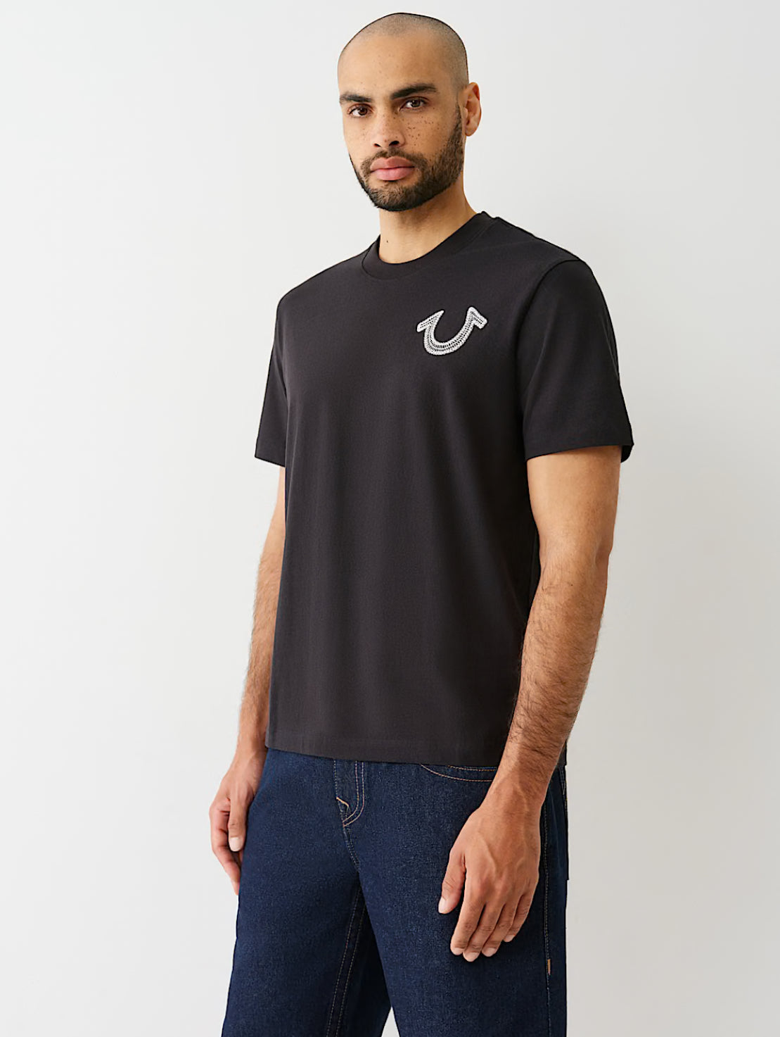 Elevate your style with our skeleton horseshoe t-shirt! Made with 100% cotton, this crew neck and short sleeve tee features a striking white embroidered skeleton horseshoe logo on the chest. Experience comfort and trendiness all in one with this must-have shirt.