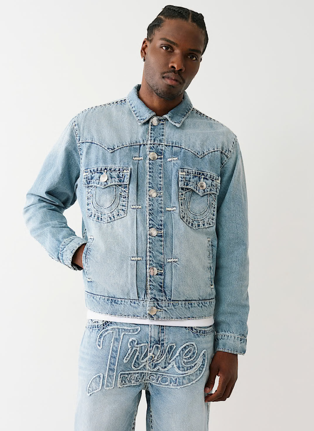 Elevate your style with our oversized logo appliqué super t denim jacket, featuring a versatile bleached medium wash that pairs effortlessly with any outfit. This western-inspired denim jacket boasts classic button-up front closure and a traditional collar for timeless appeal. Distinctive western yokes add authentic character, while the eye-catching logo appliqué across the back ensures you'll stand out from the crowd. Finished with our signature Super T stitching—a mark of exceptional quality and craftsmanship that discerning denim enthusiasts will immediately recognize.